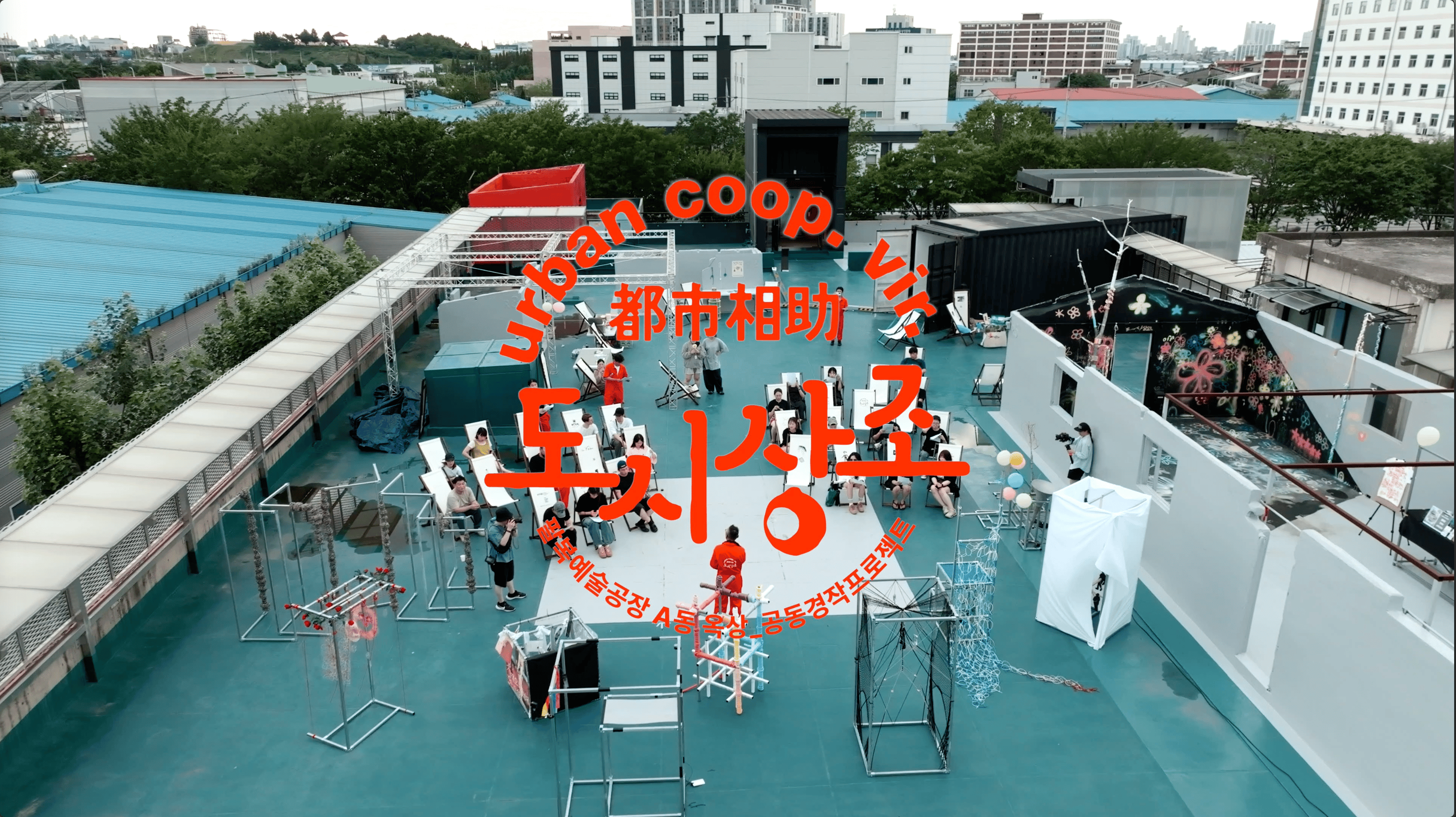 ν볡μμ 곡μ₯μ μ₯μμ΄λΌλ μ ν΄ κ³΅κ°μ μμ μ μ€νμ μ₯μΌλ‘ νλ°κΏμμΌ°μ΅λλ€. λλ νμ°μ§(Do/do Housing)μ 9κ°μ μνλ€μ΄ μ₯μ κ³³κ³³μ ν©μ΄μ§κ³ μ΄λνλ©° μ¦μνλ κ³Όμ μΌλ‘ μ ννλ μ μ 곡κ°μ λ²μ΄λ λμμ νκ²½κ³Ό μνμ΄ μ΄μ°λ¬μ§λ μ°°λμ μκ°λ€μ ν¬μ°©νμ¬, μμ μ΄ μΌμκ³Ό 곡κ°μ κ°μ νλ λ°©μμ μλμ μΌλ‘ νννμ΅λλ€.